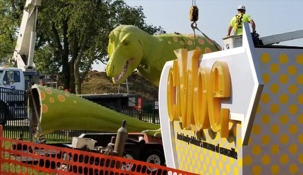 The well-known dinosaur figure formerly marked the location of the Children’s Museum of Evansville downtown, but she had to be moved for the construction of the new medical school.