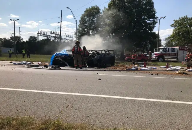 The Vanderburgh County Coroner’s Office says a mother and two children are dead in a fiery collision at 41 and Covert Monday afternoon.