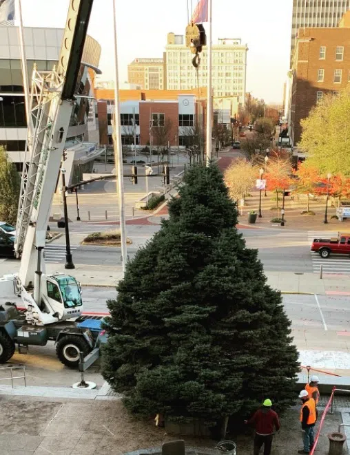 The huge Christmas Tree for the City of Evansville has arrived the Civic Center.