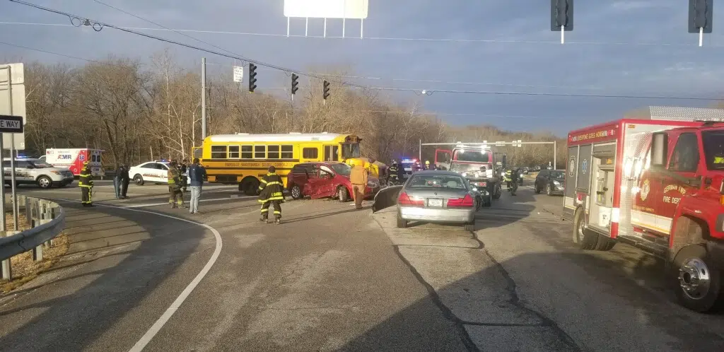 A single child was on the school bus at the time of the accident but was not injured. The driver of the school bus and the Grand Marquis did not require medical attention on scene. The driver of the Envision was taken to Deaconess Hospital for non-life threatening injuries.