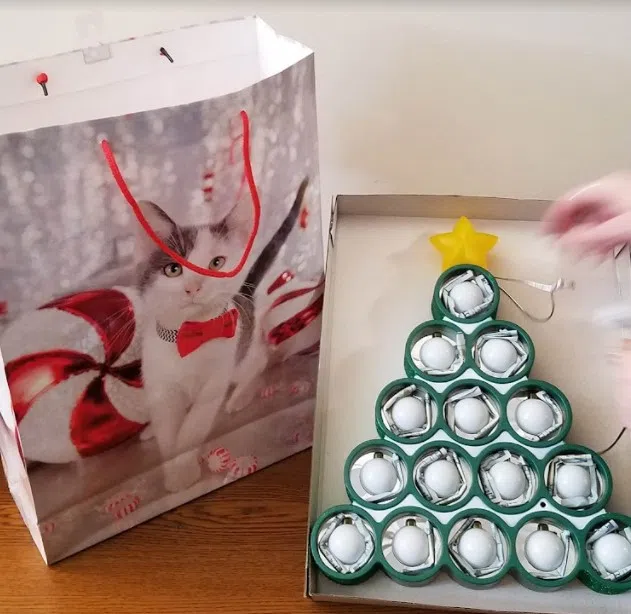 There, they found a bag shaped like a Christmas tree, with thirty $100 bills rolled up along side the lighted bulbs.