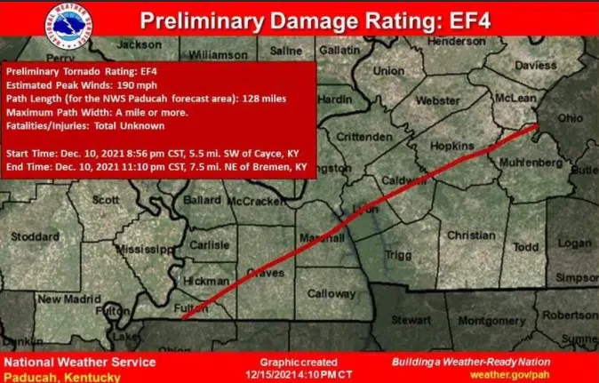 NWS officials say they have determined the tornado that traveled from Fulton County to Muhlenberg County as an EF-4 tornado.