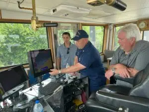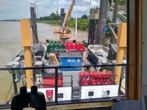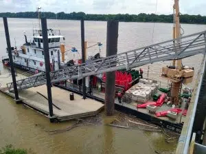 Paired with a 100 foot construction barge, the Obion makes sure the maintenance and upkeep of the buoys, daymarks, lights and channel markers are in working order.