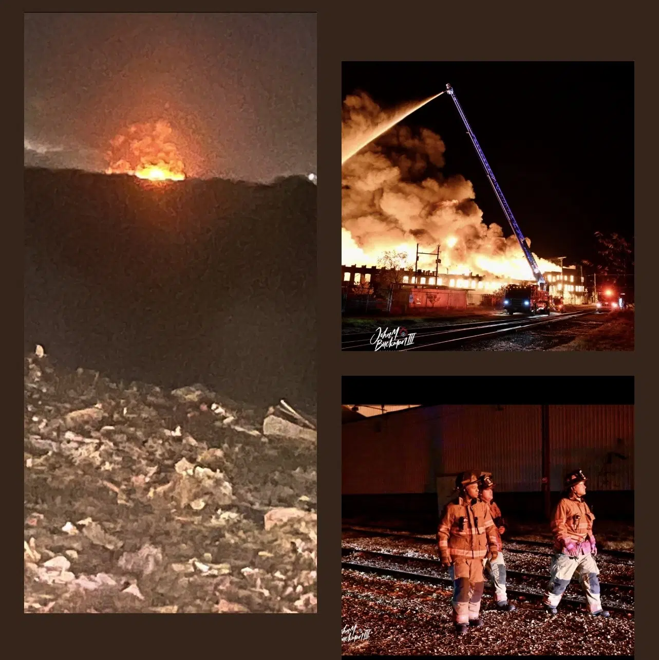 Portions of the warehouse building have collapsed, so firefighters can’t get inside.