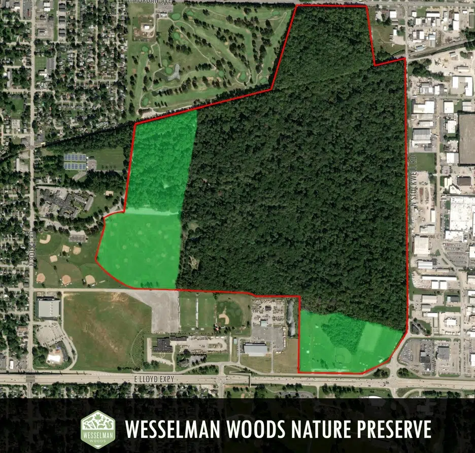 The first portion was gifted from the city of Evansville that includes the 32 acre former Par 3 golf course and the 16 acre forested middle section of Wesselman Park.