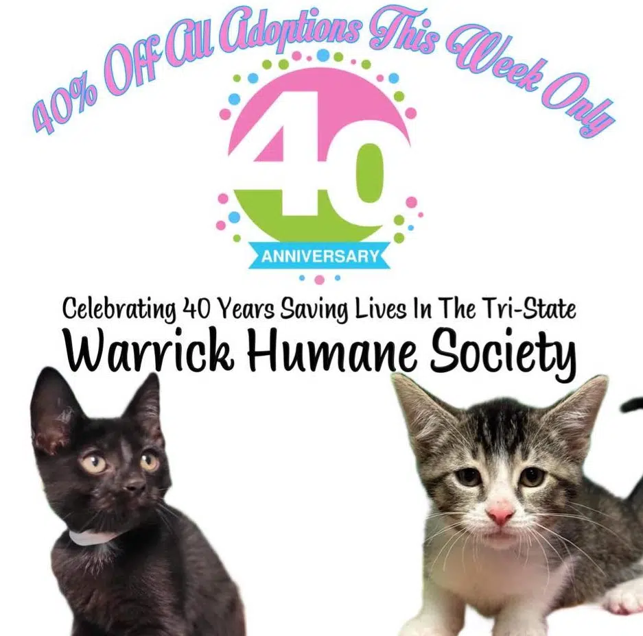 The Warrick Humane Society is celebrating its 40th anniversary and will take 40% off all adopted pets this week only.