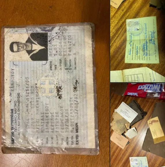 In a vent, crew members found a Greek Navy sailor’s wallet containing an ID card and several other items.