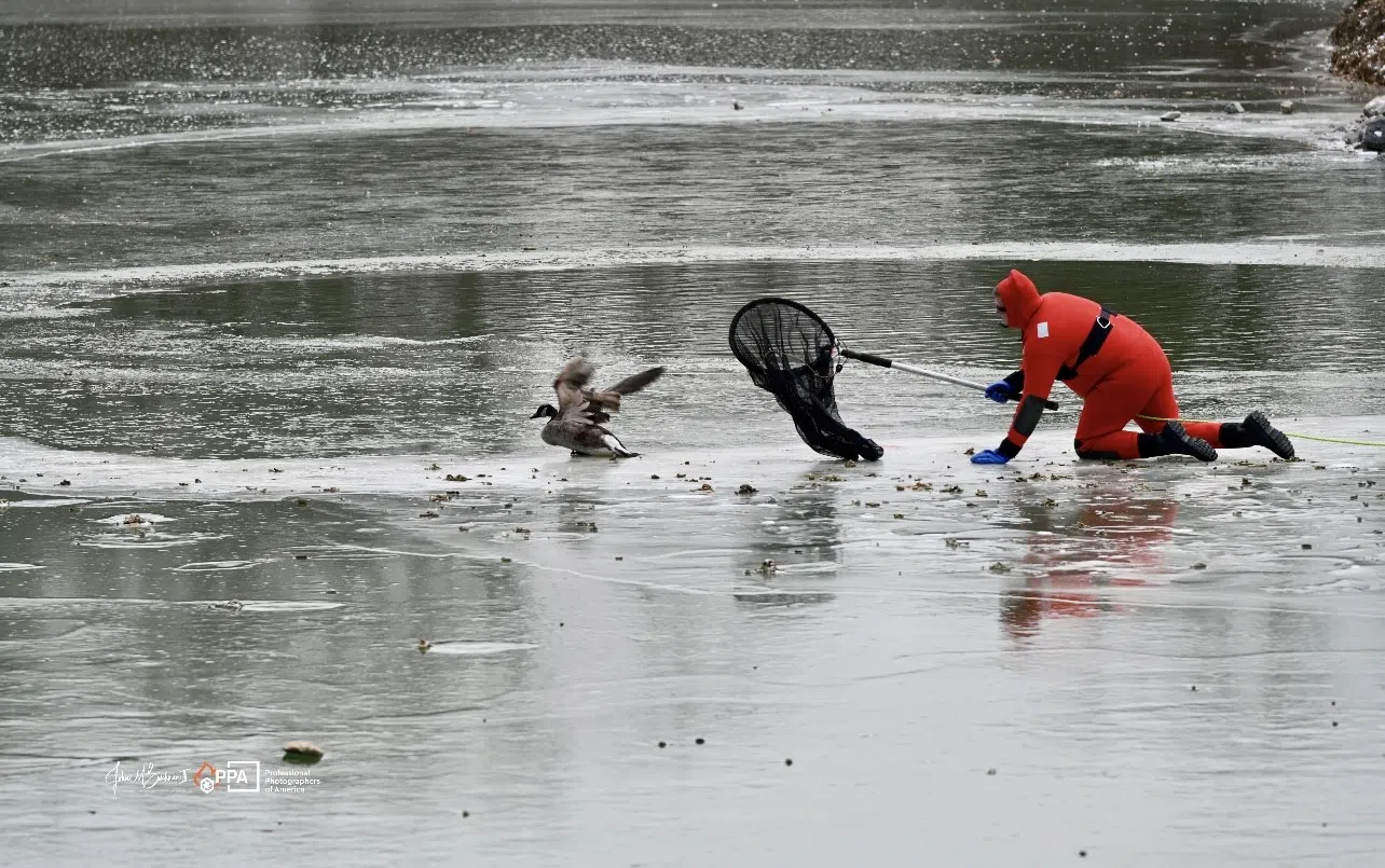 Once on scene firefighters “gandered” at the situation and spotted a goose believed frozen in the pond.