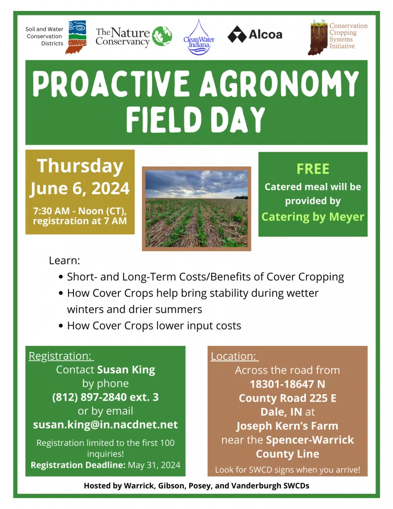 Proactive Agronomy Field Day will be June 6th. Topics will include: Cover cropping long term, and how cover crops lower input costs Register by calling Warrick soil and water at 812-897-2840. You must register by 5/31/24.