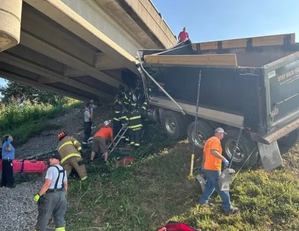 Authorities say the dump truck was heading south when it left the road and crashed into the overpass support structure on Newbolt Road.