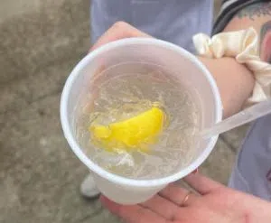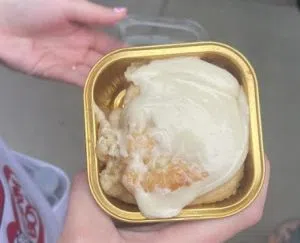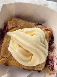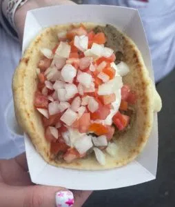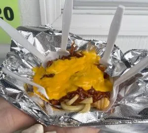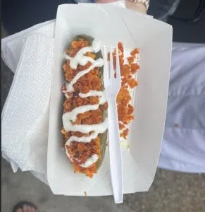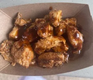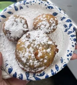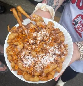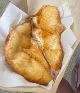 It’s a funnel cake topped with hot honey and grippos and powdered sugar.