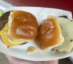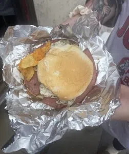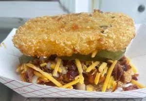 It’s german bologna, cheese, and yummy toppings between two hash browns.