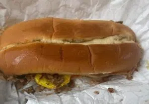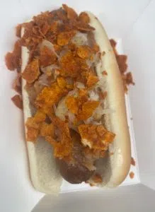 The west side burgoo dog is covered in sauerkraut, burgoo, and grippos.