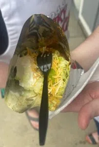 Inside is a forkful of pulled pork, lettuce, cheese, grippos, and sour cream.