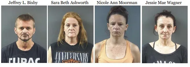 On Friday morning, arrest and search warrants were issued for the following suspects: 43-year-old Jeffrey Bixby, 38-year-old Nicole Ann Moorman, 43-year-old Sara Beth Ashworth, and 41-year-old Jesse Mae Wagner.