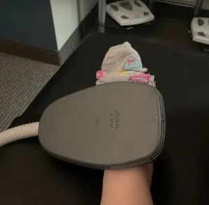 Above is my numb, pain-ridden foot being treated with the Emsculpt Neo device. I covered my toes with my sock because they were cold as ice cubes, plus I need a pedicure badly. At this point, I couldn’t feel the electromagnetic pulses or the heat.