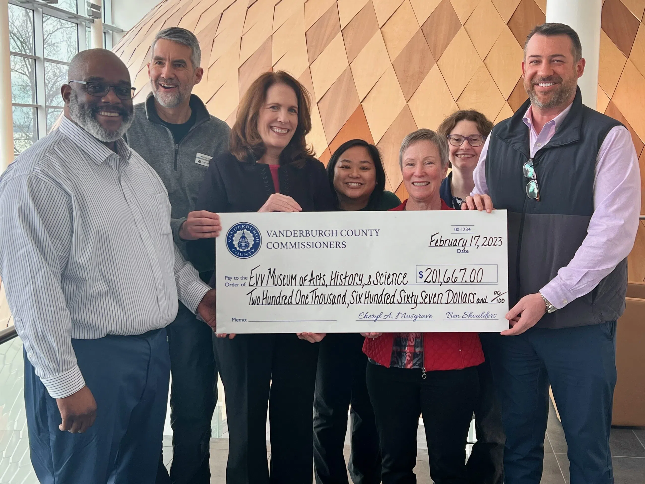 The Evansville Museum of Arts, History and Science received funding from Vanderburgh County. Commissioners Cheryl Musgrave and Ben Shoulders presented them a check for $201,667.00. The funds were in p...